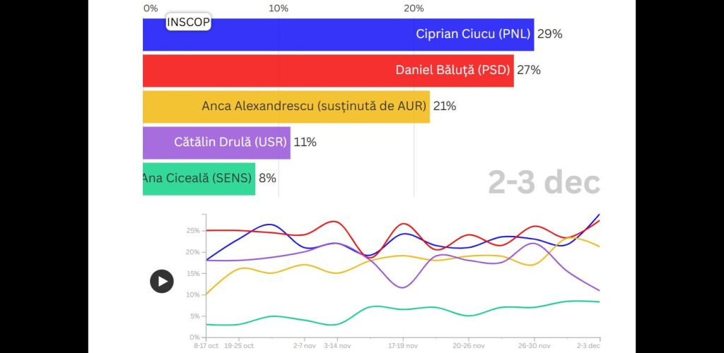 4. Realizatoarea TV Anca Alexandrescu de la Realitatea Plus, ce candidează ca independentă, fiind susținută însă de AUR, se află pe locul 2 într-un singur sondaj de opinie, cel realizat de AtlasIntel la sfârșitul lunii noiembrie, care a plasat-o la doar 0,1% în spatele lui Daniel Băluță.