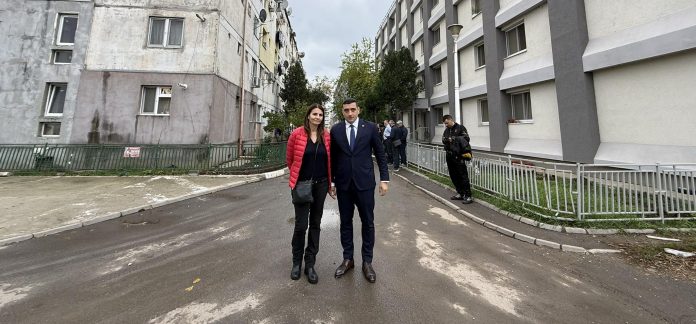 George Simion, președintele AUR, s-a pozat ieri alături de realizatoarea Anca Alexandrescu, ce candidează la primăria generală din partea AUR, între două blocuri din sectorul 6, susținând că în clădirea reabilitată stau migranții, în vreme ce în blocul celălalt, care în imagine arată insalubru, stau românii.