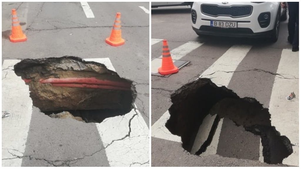 Asfaltul s-a surpat în dreptul unei treceri de pietoni din centrul Bucureștiului. În groapa produsă a căzut mașina unei firme de pază, care a fost scoasă ulterior.