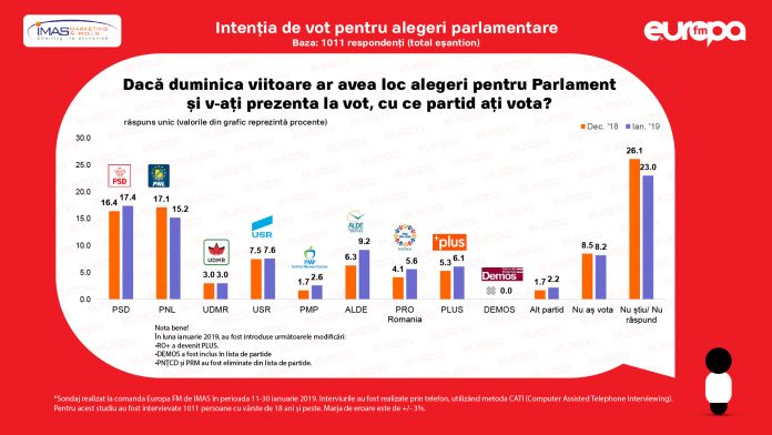 Un sondaj realizat de IMAS, la comanda Europa FM, arată că PSD rămâne, la limită, pe primul loc în opțiunile de vot ale românilor, dacă alegerile parlamentare ar avea loc în această duminică.