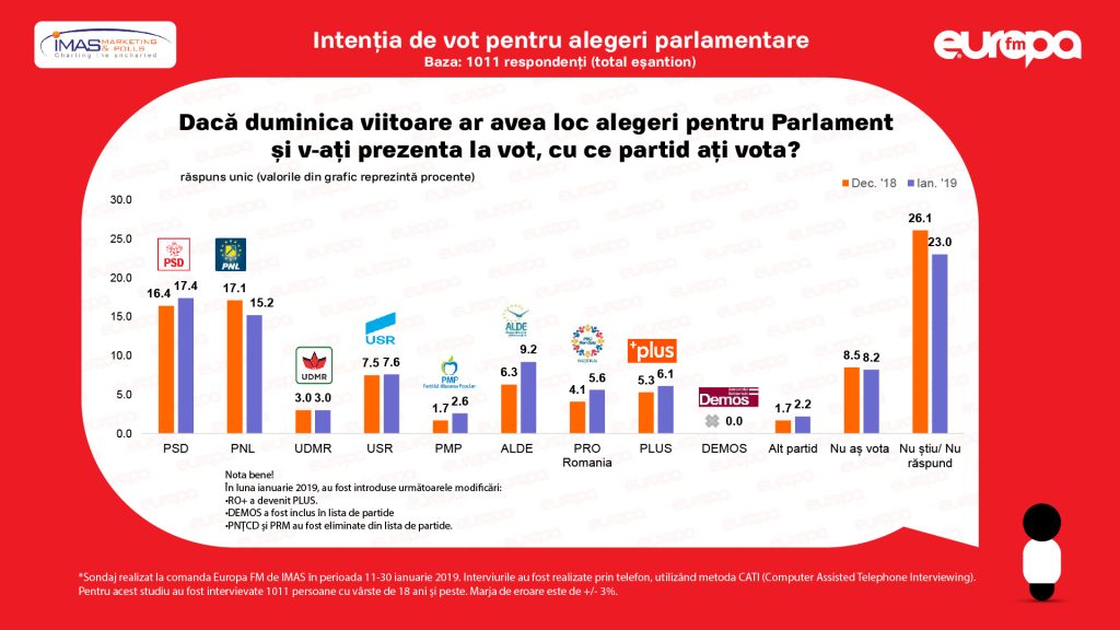 Perioada de realizare a interviurilor: 11 – 30 ianuarie 2019. Eroarea de eşantionare este de +/- 3,1%.