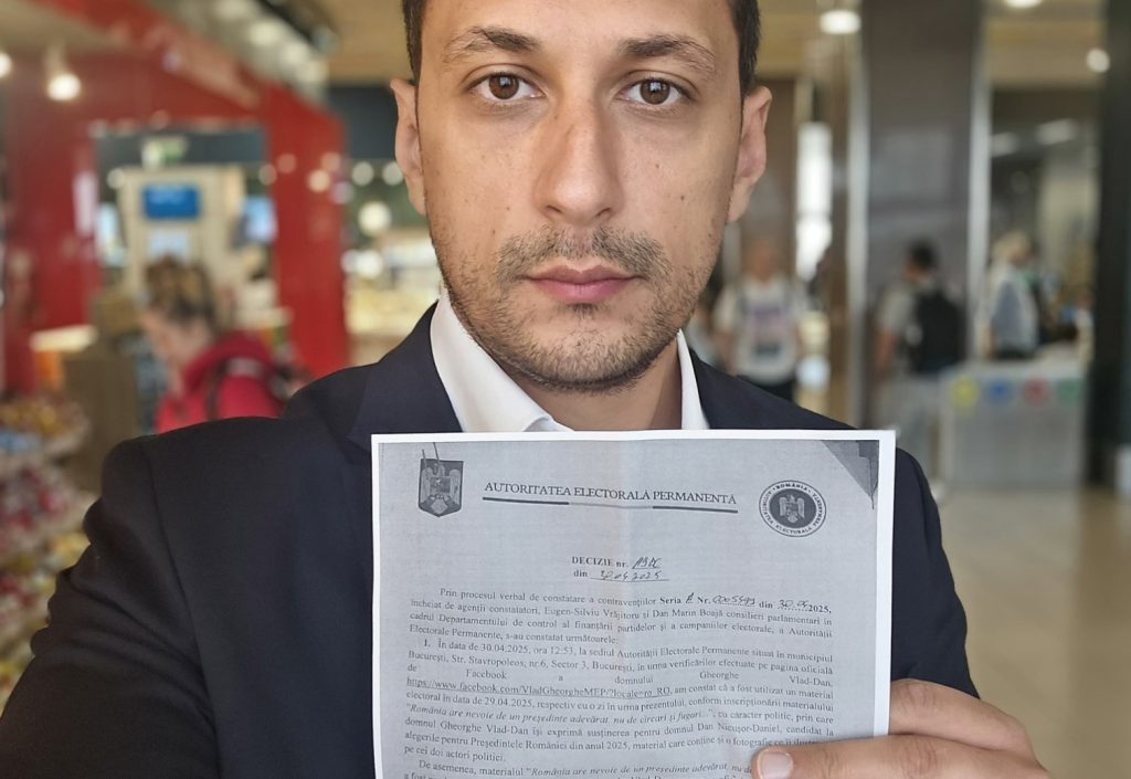 „Am primit amendă de 15.000 de lei de la AEP. Pentru că am scris pe Facebook că îl susţin pe Nicuşor Dan. Serios. După prima dezbatere televizată din primul tur, am scris un text în care spuneam că Simion a fugit de confruntare, iar prestaţia celorlalţi candidaţi mi-a confirmat opţiunea: îl susţin pe Nicuşor Dan. AEP a văzut postarea şi… m-a amendat cu 15.000 de lei. Motivul? Că nu am etichetat postarea cu CMF – cod de mandatar financiar. Şi asta, deşi nu am fost contracandidat şi nici nu am distribuit materiale electorale oficiale. Eram un cetăţean – politician, da – care şi-a exprimat o opinie. Ăsta a fost «delictul»”, afirmă fostul europarlamentar Vlad Gheorghe într-o postare pe pagina sa de Facebook.