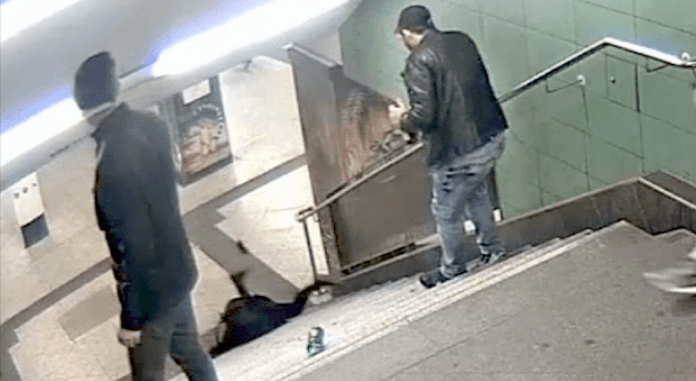 În imagini se vede cum un grup de patru bărbați coboară după o tânără. În timp aceasta coboară scările, unul dintre ei, care avea o bere în mână și fuma, o lovește puternic cu piciorul în spate.