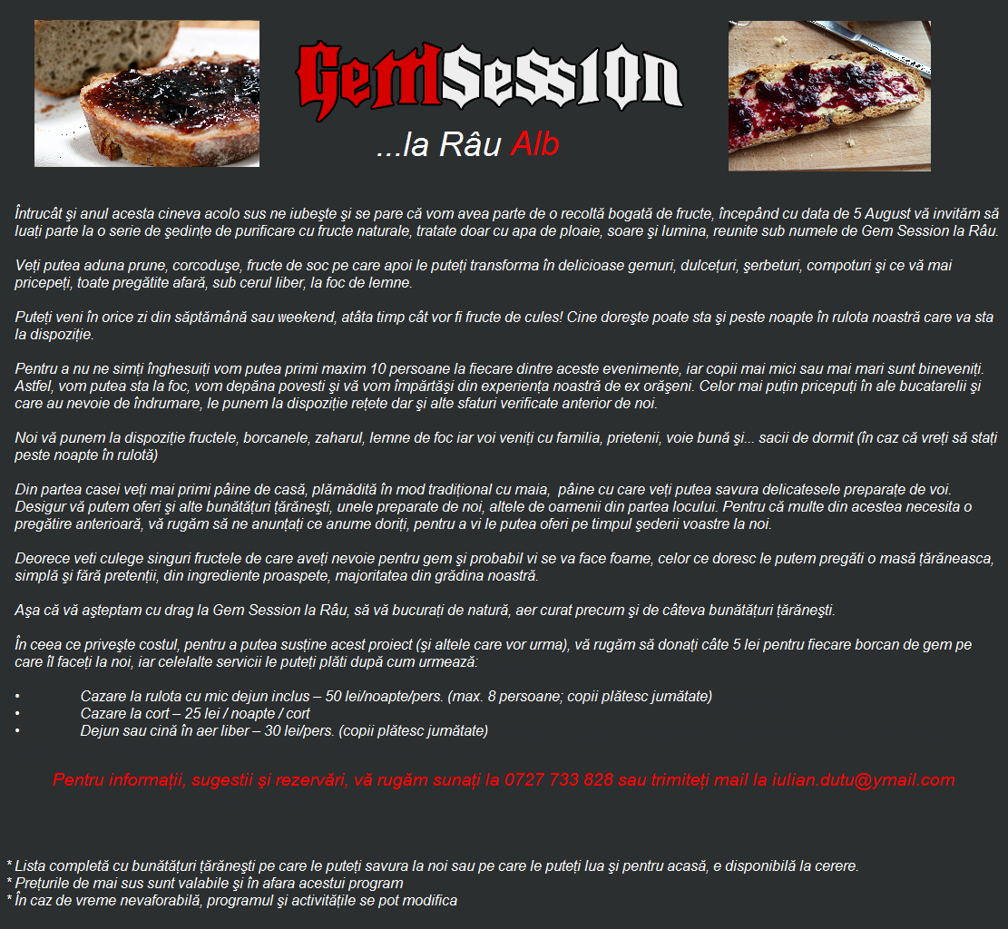 O invenție a brutarului sunt „sesiunile de gem” („Gem Session la Râu”). Peste vară, orășenii vin în sat și adună prune, corcodușe sau fructe de soc din livada lui, din care fac apoi, la foc de lemne, gemuri, dulcețuri, șerbeturi sau compoturi. Cei care nu prea se pricep primesc sfaturi și rețete de la familia Duțu.