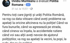 „Pentru toţi care jigniţi şi urâţi Poliţia Română, vă rog ca data viitoare când aveţi probleme să apelaţi la oricine altcineva, nu la poliţie. Când vă fură bunurile, când vă agresează pe stradă, la accidente rutiere, vă rog să apelaţi la vecini, la popi, la rude, dar nu la poliţie”, a scris Ovidiu Munteanu pe pagina de Facebook a Poliției. Ulterior a șters mesajul.