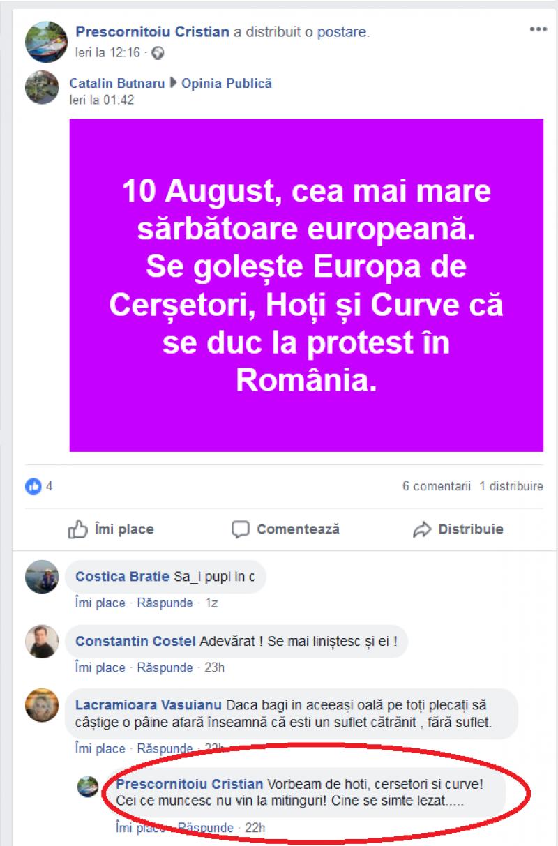 „10 August, cea mai mare sărbătoare europeană. Se golește Europa de Cerșetori, Hoți și Curve că se duc la protest în România”, scrie în postarea distribuită de angajatul din subordinea Guvernului României.