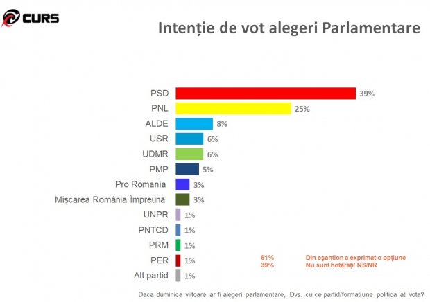 Același sondaj mai spune că în ceea ce privește partidele, pe primul în topul preferințelor alegătorilor se află PSD, cu 39%, urmat de PNL, cu 25% și ALDE, care ar obține 8%. De asemenea, USR ar obține 6%, UDMR – 6%, PMP – 5%, Pro România – 3%, Mișcarea Împreună – 3% și câte 1% din voturi ar lua UNPR, PNTCD, PRM și PER.