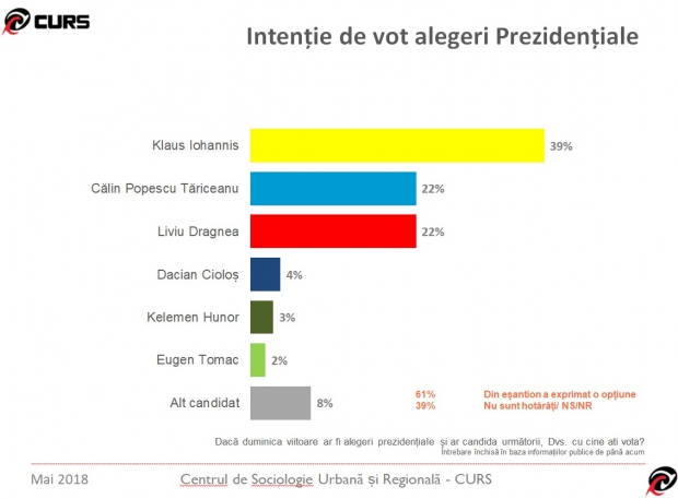Dacă duminica viitoare ar avea loc alegeri, în primul tur, președintele Klaus Iohannis ar câștiga 39% din voturi. Dacă din partea PSD ar candida Liviu Dragnea, acesta ar primi 22%, la fel ca liderul ALDE, Călin Popescu Tăriceanu, potrivit stiripesurse.ro.