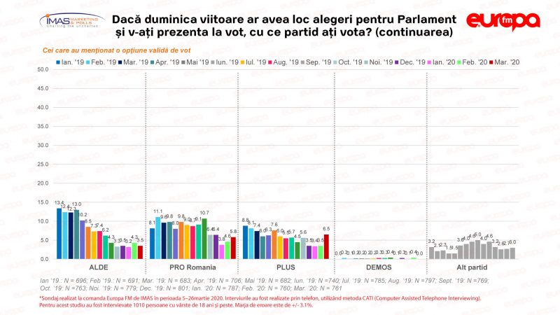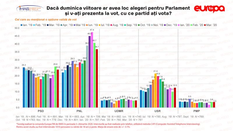 Un sondaj efectuat de IMAS, realizat la comanda Europa FM, în perioada 5-26 martie, acoperind practic și începutul crizei de coronavirus, arată că PNL și PSD au scăzut în intențiile de vot, în timp ce USR, PLUS și Pro România au crescut.