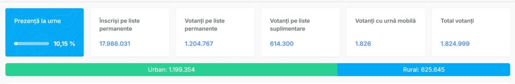 Până la ora 10 au votat în turul 1 al alegerilor prezidențiale 10,15% dintre românii înscriși pe listele permanente, adică peste 1,8 milioane de oameni. Prezența este cu aproape 3 procente mai mare față de turul 1 al alegerilor prezidențiale de anul trecut, când la ora 10 se înregistra o prezență de 7,20%. O mare parte din diferență provine din diaspora, unde a votat un număr dublu de români față de anul trecut (luând în calcul aceeași oră).