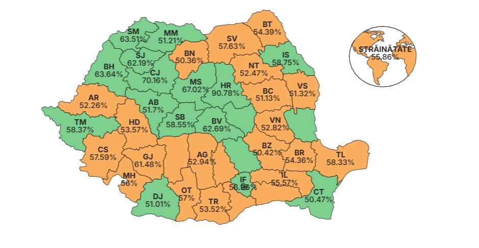 Deși a pierdut alegerile, George Simion a câștigat în 24 de județe din țară, cel mai mare scor obținându-l în județul Gorj. Aici, el a fost votat de peste 61,48% dintre alegătorii care s-au prezentat la urne.