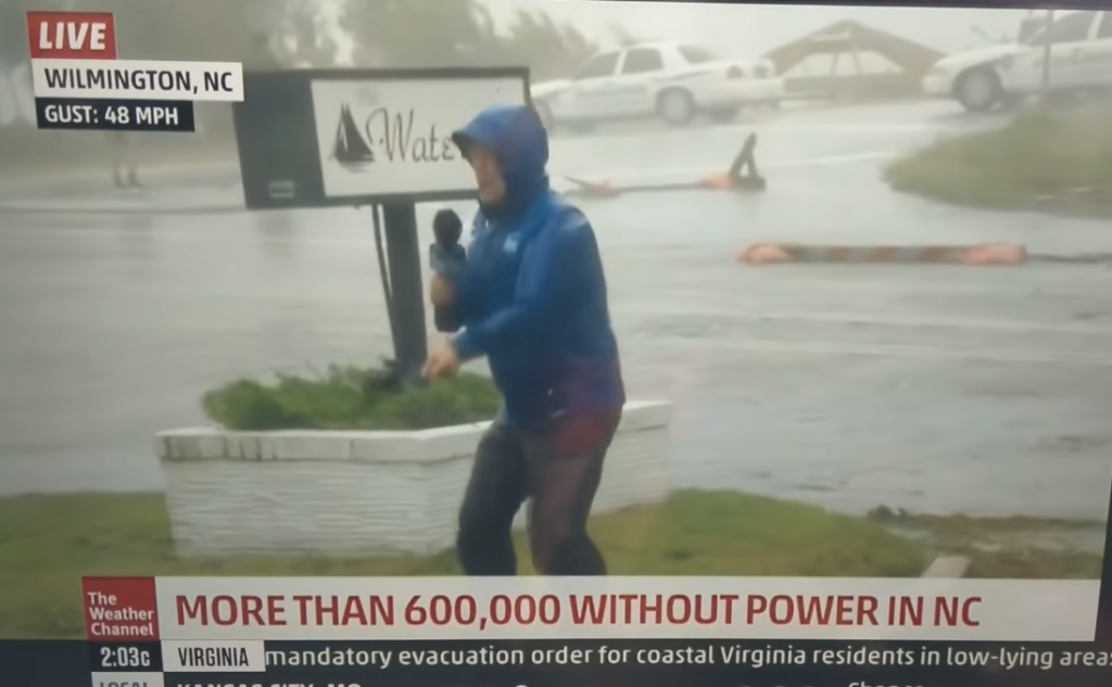 Imaginile cu intervenția unui reporter de televiziune dintr-o localitate afectată de Uraganul Florence s-au viralizat pe internet.